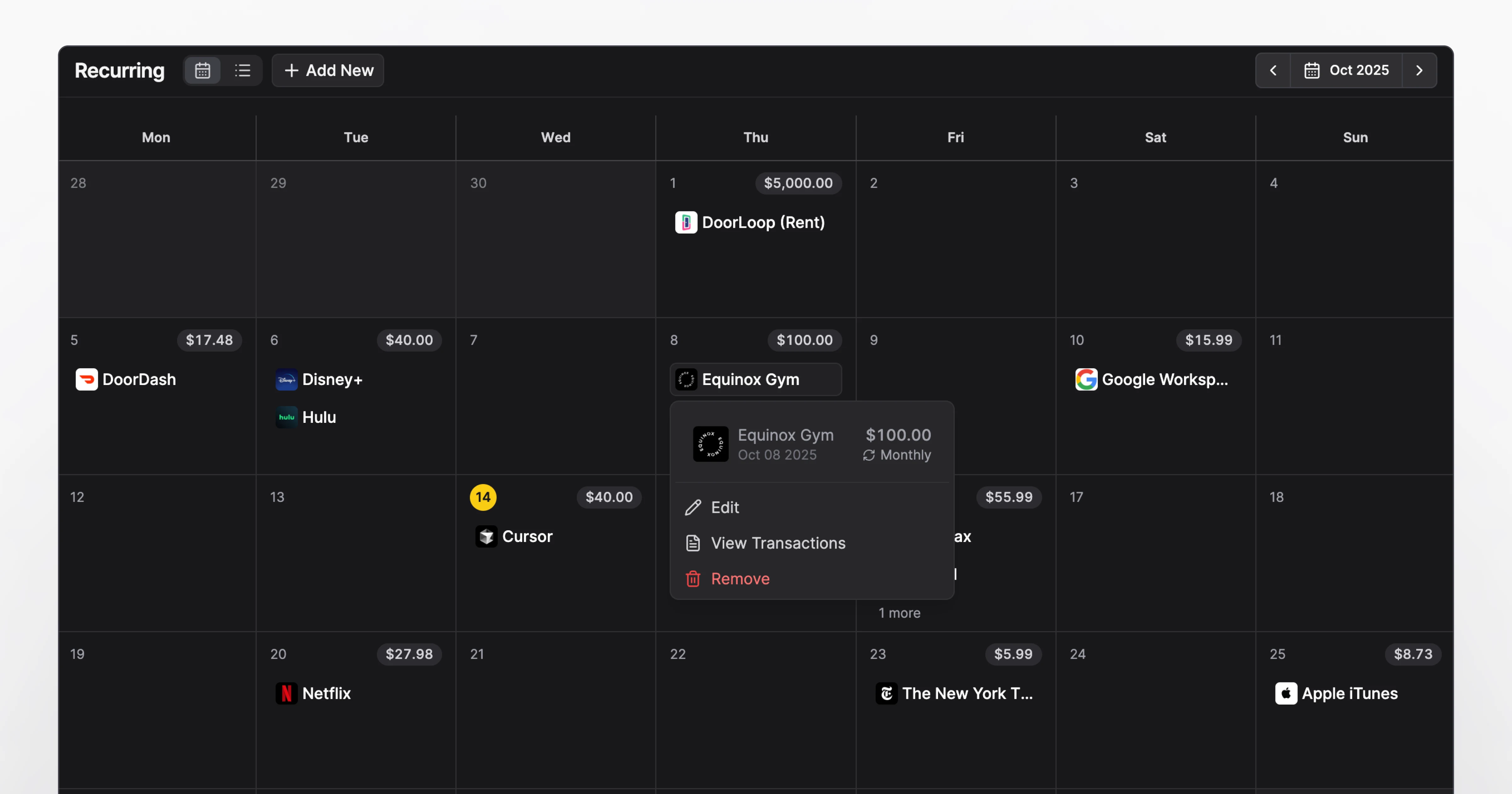 Automation handles the heavy lifting, but you stay in charge. Add, edit, or remove recurring charges anytime.